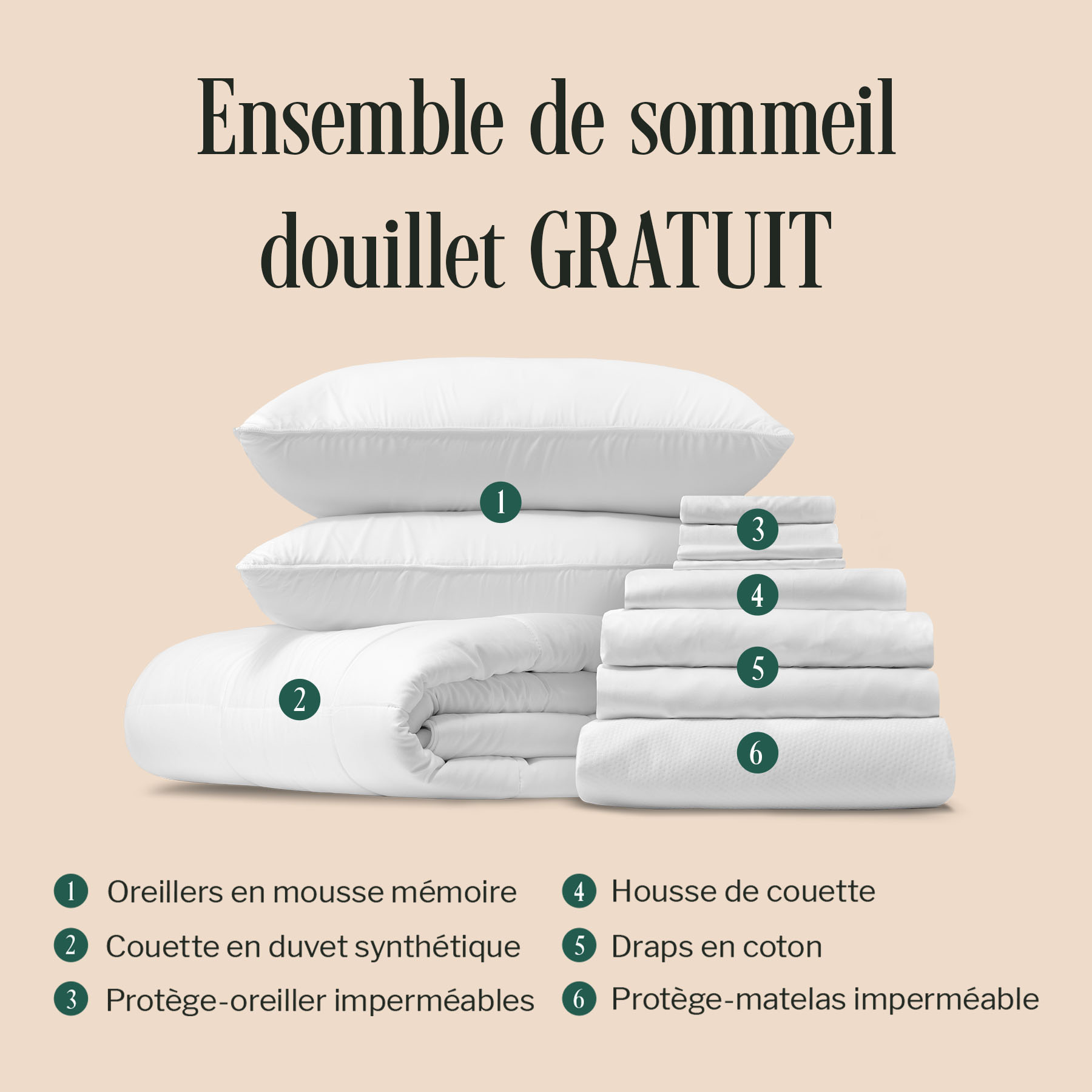 **Conditions : Offre valable jusqu’à épuisement des stocks. L’offre sera appliquée automatiquement lorsqu’un matelas sera ajouté au panier. L’offre s’applique à un maximum d’un (1) Ensemble de sommeil premium de la même taille que le matelas ajouté au panier. L’ensemble de sommeil premium comprend 2 oreillers ajustables en mousse mémoire, 1 protège-matelas, 1 ensemble de draps en bambou, 1 couette, 1 housse de couette et 2 protège-oreillers pour les commandes d’un matelas de taille Double, Grand/Queen, Très grand/King, Très grand cal/King cal ; 2 oreillers ajustables en mousse mémoire, 2 protège-matelas, 2 ensembles de draps en bambou, 1 couette, 1 housse de couette et 2 protège-oreillers pour les commandes d’un matelas de taille Très grand divisé/Split king ; 1 oreiller ajustables en mousse mémoire, 1 protège-matelas, 1 ensemble de draps en bambou, 1 couette, 1 housse de couette et 1 protège-oreiller pour les commandes d’un matelas de taille Simple XL, ou Simple. L’offre ne peut être appliquée de façon rétroactive. Notre politique générale de retour s’applique à tout retour. L’offre peut être modifiée sans préavis.